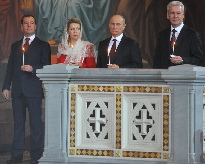 Ο πρόεδρος της Ρωσίας, Ντμίτρι Μεντβέντεφ με τη γυναίκα του Σβετλάνα, ο πρωθυπουργός της χώρας, Βλαντίμιρ Πούτιν και ο δήμαρχος της Μόσχας, Σεργκέι Σαμπιάνιν παρευρέθηκαν στην εκκλησία του Πανάγιου Τάφου για την ανάσταση.Ο Πατριάρχης Κύριλλος έδωσε αυγά στους ανώτατους αξιωματούχους της χώρας, και με τη σειρά του ο Ντμίτρι Μεντβέντεφ έδωσε ένα από τα δικά του αυγά στον Πατριάρχη.