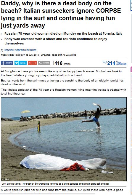 Όπως βλέπετε και από τη φωτογραφία που δημοσιεύει η βρετανική Daily Mail, οι λουόμενοι συνέχισαν τις ανέμελες στιγμές τους ακόμα και αν δίπλα τους κείτονταν το άψυχο σώμα μιας 78χρονης Ρωσίδας, σκεπασμένο με ένα άσπρο σεντόνι.