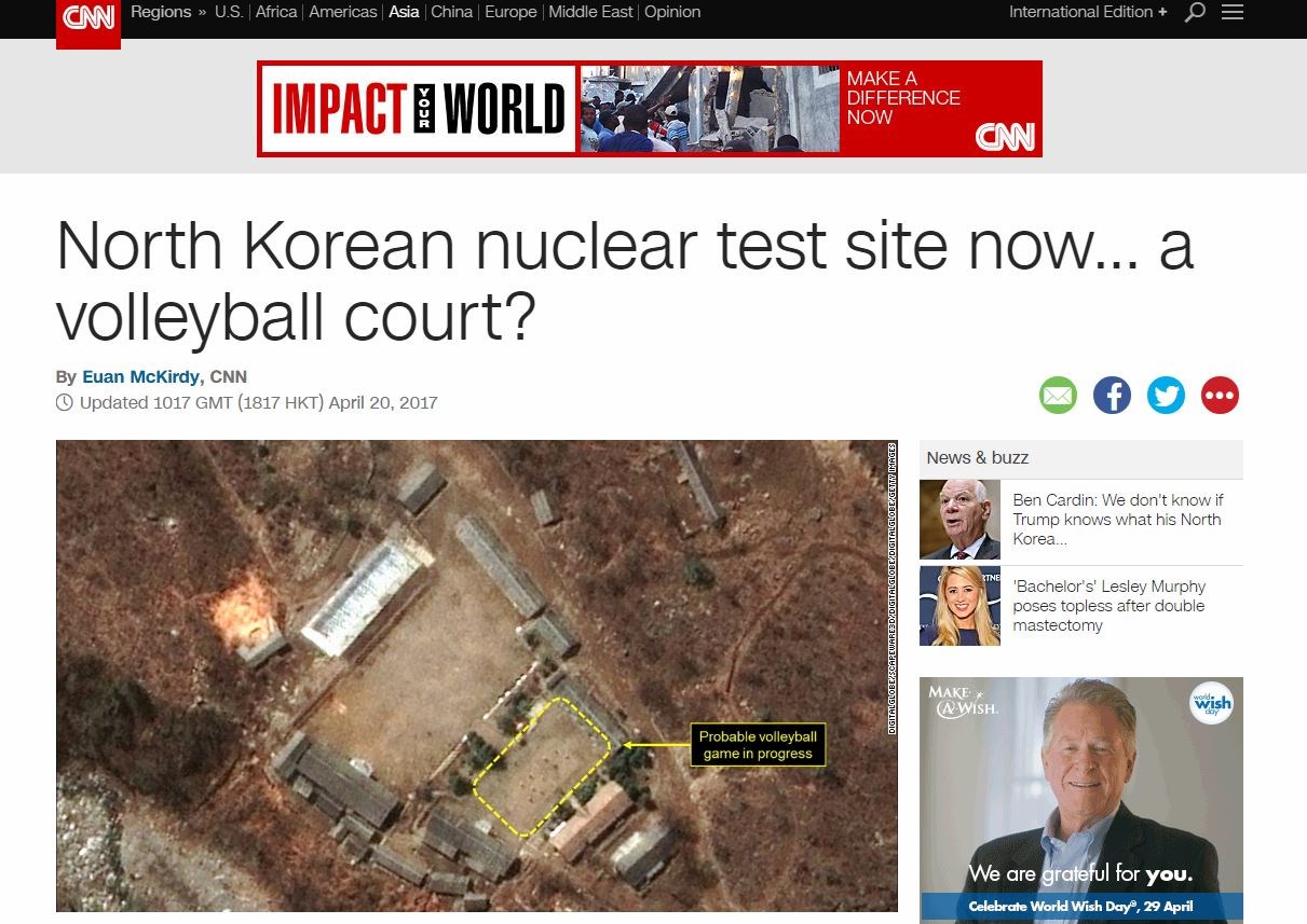 Σοκάρουν οι φωτογραφίες αμερικανικού κατασκοπευτικού δορυφόρου που δείχνουν Βορειοκορεάτες να παίζουν βόλεϊ σε σημείο που χρησιμοποιείται για δοκιμή πυρηνικών όπλων, στην Πιονγιάνγκ.Οι φωτογραφίες είναι τραβηγμένες στις 16 Απριλίου και σύμφωνα με όσα υποστηρίζουν οι Αμερικανοί, αποδεικνύεται μία μικρή δραστηριότητα σε τούνελ των εγκαταστάσεων, για την προετοιμασία δοκιμής πυρηνικού όπλου.Στην φωτογραφία, μάλιστα, φαίνεται να διεξάγονται τρεις αγώνες βόλεϊ σε διαφορετικά σημεία, ενώ διακρίνεται κι ένας τέταρτος.Οι ΗΠΑ πιστεύουν ότι οι αγώνες διεξήχθησαν κατά την αναμονή της προετοιμασίας για το αποτυχημένο τεστ, το οποίο αποτέλεσε απειλή για τους Αμερικανούς.ΠΗΓΗ: CNN.com