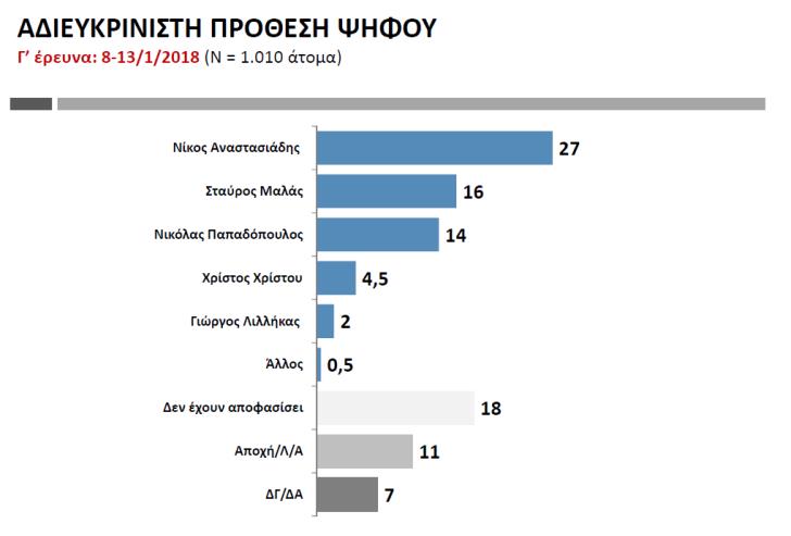 Αναλυτικά η αδιευκρίνιστη ψήφος: Νίκος Αναστασιάδης 27%, Σταύρος Μαλάς εξασφαλίζει 16%, Νικόλας Παπαδόπουλος 14%, Χρίστος Χρίστου 4,5% και Γιώργος Λιλλήκας 2%. Οι άλλοι υποψήφιοι συγκεντρώνουν 0,5%. Το ποσοστό όσων δεν έχουν αποφασίσει ανέρχεται στο 18% και η αποχή στο 11%. Ποσοστό 7% δηλώνει ότι δεν απαντά.