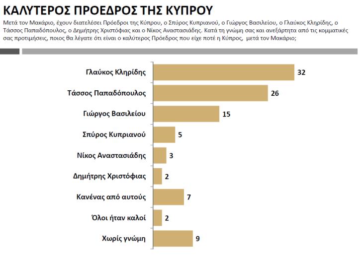 Σε ερώτημα για το ποιον θεωρούν καλύτερο Πρόεδρο της Κυπριακής Δημοκρατίας, μετά τον Μακάριο, ο Γλαύκος Κληρίδης αναδεικνύεται ο καλύτερος Πρόεδρος με ποσοστό 32%. Ο Τάσσος Παπαδόπουλος ακολουθεί με ποσοστό 26%, ο Γιώργος Βασιλείου με 15%, ο Νίκος Αναστασιάδης συγκεντρώνει το ισχνό 3% μία μονάδα πάνω από τον Δημήτρη Χριστόφια.