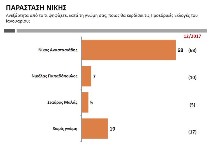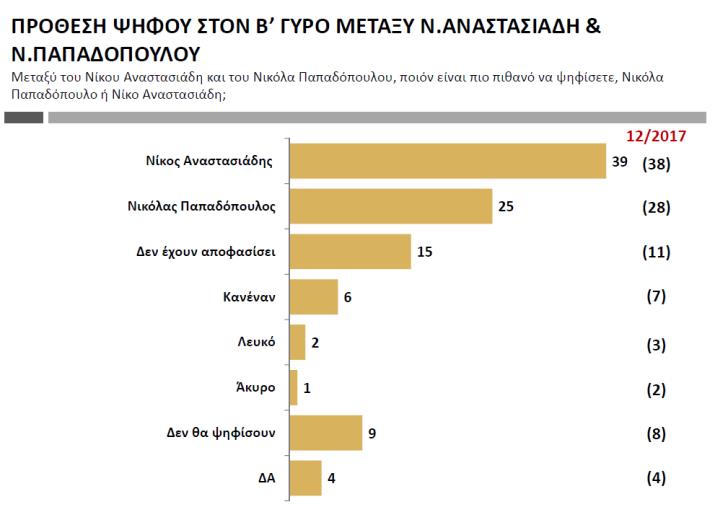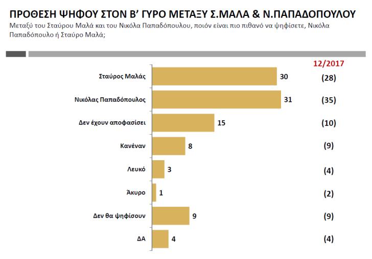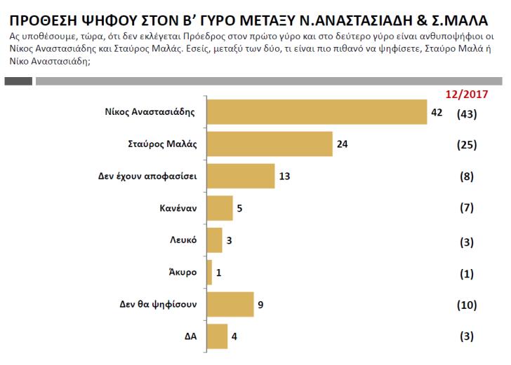 Δεύτερος γύρος Και στα δύο σενάρια του δευτέρου γύρου, νικητής αναδεικνύεται ο Νίκος Αναστασιάδης. Ο σημερινός πρόεδρος κερδίζει τον Σταύρο Μαλά με ποσοστό 42% έναντι 24% του δευτέρου, ενώ στο σενάριο να βρεθεί αντιμέτωπος με τον Νικόλα Παπαδόπουλο, κερδίζει ο πρώτος με ποσοστό 39% έναντι 25% του δεύτερου. Στο σενάριο να βρεθούν αντιμέτωποι στον δεύτερο γύρο οι Νικόλας Παπαδόπουλος και Σταύρος Μαλάς, επικρατεί ο πρώτος με μια μονάδα διαφορά.