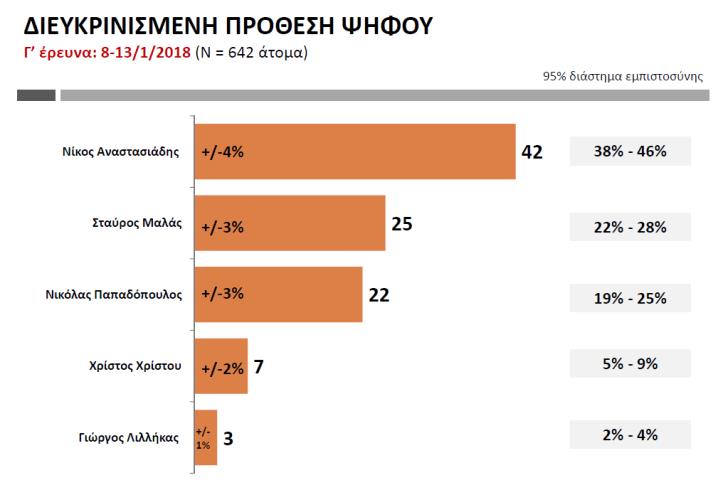 Στη διευκρινισμένη ψήφο ο Νίκος Αναστασιάδης φαίνεται να εξασφαλίζει ποσοστό 42% με απόκλιση συν/πλην 4%. Ο Σταύρος Μαλάς ποσοστό 25% και απόκλιση συν/πλην 3%. Ο Νικόλας Παπαδόπουλος 22% με απόκλιση συν/πλην 3%. Ο πρόεδρος του ΕΛΑΜ ποσοστό 7% με απόκλιση συν/πλην 2% και ο Γιώργος Λιλλήκας ποσοστό 3% με απόκλιση 1%.