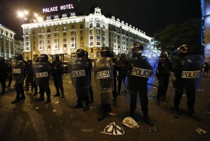 Κατά τη διάρκεια των σοβαρών επεισοδίων έξω από την ισπανική Βουλή τραυματίστηκαν 14 άτομα και έγιναν 23 προσαγωγές από τις αρχές.H ισπανική αστυνομία έκανε χρήση χημικών και πλαστικών σφαιρών. Κατά διαστήματα οι αστυνομικοί πραγματοποίησαν εφόδους κατά του πλήθους, έχοντας καταφέρει έτσι να μειώσουν τον αριθμό των διαδηλωτών, αλλά όχι να σταματήσουν τη διαδήλωση.Σημειώνεται ότι η κυβέρνηση Ραχόι θα ανακοινώσει την Πέμπτη νέα μέτρα. Δείτε τις φωτογραφίες από την elpais.com
