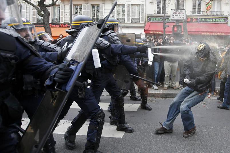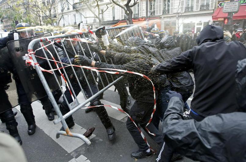 Περίπου 200 διαδηλωτές, ορισμένοι με καλυμμένα τα πρόσωπα, συγκρούστηκαν με την αστυνομία σε έναν δρόμο που οδηγεί στην πλατεία, η οποία έχει γίνει σημείο συγκέντρωσης για τους Παριζιάνους μετά τις τρομοκρατικές επιθέσεις της 13ης Νοεμβρίου, σύμφωνα με το Αθηναϊκό Μακεδονικό Πρακτορείο Ειδήσεων.