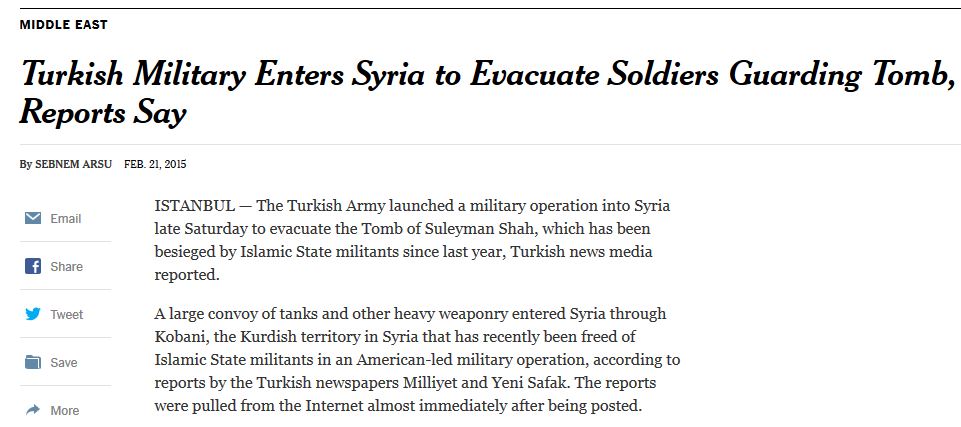 Ο τουρκικός στρατός ξεκίνησε στρατιωτική επιχείρηση στη Συρία αργά το Σάββατο για να εκκενώσει τον Τάφο του Σουλεϊμάν Σαχ, ο οποίος πολιορκείται από τζιχαντιστές, ανέφεραν τουρκικά μέσα ενημέρωσης, σύμφωνα με τους New York Times.