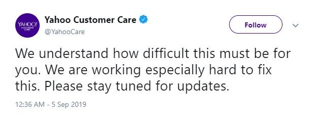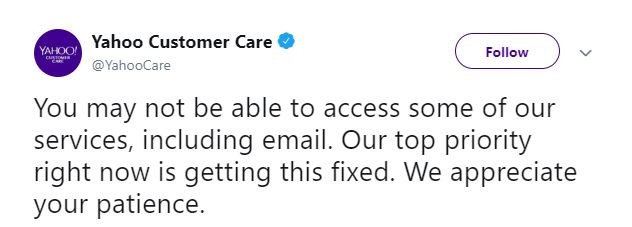 “Μπορεί να μην μπορείτε να έχετε πρόσβαση σε κάποιες από τις υπηρεσίας μας, συμπεριλαμβανομένου του email. Η πρώτη προτεραιότητά μας αυτήν τη στιγμή είναι να διορθώσουμε” το πρόβλημα, ανακοινώνει η Yahoo Customer Care, η υπηρεσία πελατών της εταιρείας, σε μήνυμά της στο Twitter.