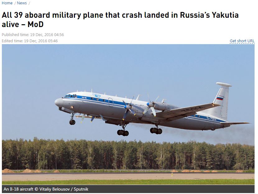 Όλοι οι επιβαίνοντες στο αεροσκάφος IL-18 που κατέπεσε στη Σιβηρία έχουν διασωθεί. Τουλάχιστον 16 από αυτούς τραυματίστηκαν, μεταδίδει το κινεζικό πρακτορείο ειδήσεων Xinhua, επικαλούμενο το ρωσικό πρακτορείο ειδήσεων RIA Novosti, σύμφωνα με πληροφόρηση που έχει από το ρωσικό υπουργείο Άμυνας.