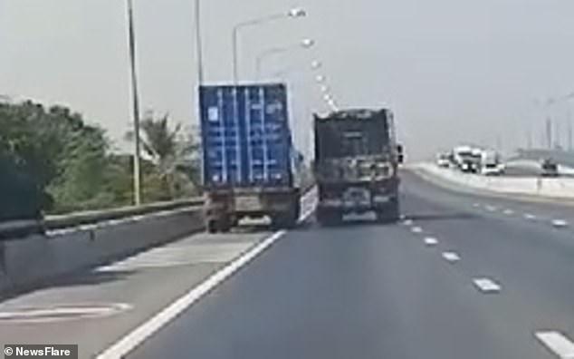 Όπως μπορείτε να δείτε ο οδηγός του μεγαλύτερου φορτηγούπροσπαθεί να προσπεράσει το άσπρο φορτηγό, αλλά του κλείνει συνεχώς τον δρόμο διακινδυνεύοντας ένα σοβαρό τροχαίο.