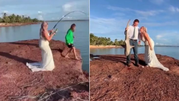 A bride got more than she bargained for with her planned wedding fishing photos when she reeled in a shark, much to the delight of her wedding guests. pic.twitter.com/QeM7sIsd9P