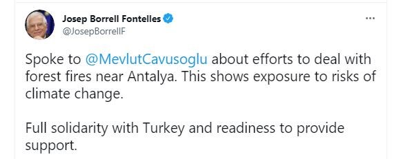 Ειδικότερα, ο Ζοζέπ Μπορέλ σε ανάρτησή του στο twitter, σημείωσε: «Μίλησα με τον Μεβλούτ Τσαβούσογλου σχετικά με τις προσπάθειες αντιμετώπισης των δασικών πυρκαγιών κοντά στην Αττάλεια. Αυτό δείχνει έκθεση σε κινδύνους της κλιματικής αλλαγής. Πλήρης αλληλεγγύη με την Τουρκία και ετοιμότητα για παροχή υποστήριξης».