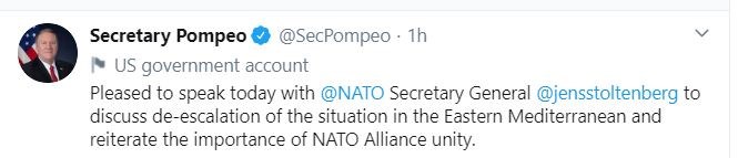 Επικοινωνία με τον γενικό γραμματέα του ΝΑΤΟ Γενς Στόλτενμπεργκ είχε ο υπουργός Εξωτερικών των ΗΠΑ Μάικ Πομπέο όπου συζήτησαν τη διατλαντική συνεργασία, την κατάσταση στην ανατολική Μεσόγειο και τη σημασία της ενότητας στη συμμαχία του ΝΑΤΟ.