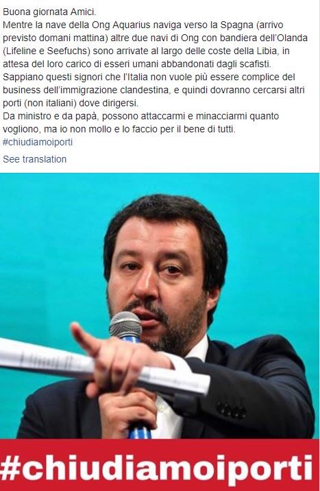 Πρόκειται για το γερμανικό Sea-Watch και το Mission Lifeline, όπως έγραψε ο Σαλβίνι, ηγέτης της Λέγκας του Βορρά, στο Facebook. «Αυτοί οι άνθρωποι θα πρέπει να γνωρίζουν ότι η Ιταλία δε θέλει πλέον να υποθάλπτει παράνομες δραστηριότητες σε σχέση με τη μετανάστευση, επομένως θα πρέπει να βρουν άλλα λιμάνια (όχι ιταλικά) για να κατευθυνθούν», αναφέρει χαρακτηριστικά στην ανάρτησή του.
