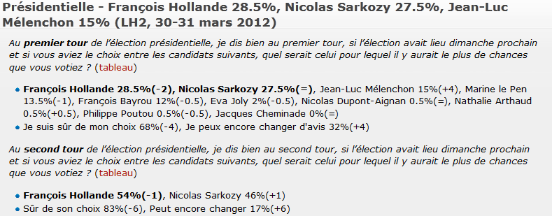 Ενώ πριν λίγες μέρες ο Φρανσουά Ολάντ ερχόταν δεύτερος στις γαλλικές δημοσκοπήσεις, με ποσοστό 26,5%, στην τελευταία δημοσκόπηση των ημερών 30 Μαρτίου με 1 Απριλίου, φαίνεται να ανεβαίνει στην πρώτη θέση, με ποσοστό 28,5%.Δεύτερος έρχεται ο Νικολά Σαρκοζί, με 27,5%, ενώ στην προηγούμενη δημοσκόπηση βρισκόταν στη θέση του Ολάντ με το αντίστοιχο ποσοστό.Σταθερή στην τρίτη θέση παραμένει η Μαρί Λεπέν με 16%.