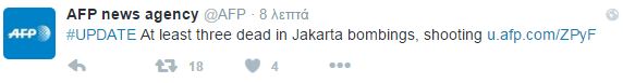 Τουλάχιστον ένας αστυνομικός είναι νεκρός σε μία σειρά εκρήξεων που σημειώθηκαν στο κέντρο της Τζακάρτα, μεταδίδουν τα μέσα ενημέρωσης της Ινδονησίας, όπως αναφέρει το AFP, ενώ ακούστηκαν και πυροβολισμοί.
