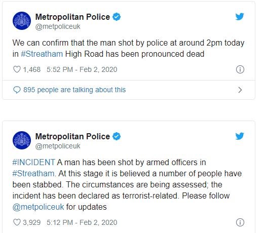 Νωρίτερα, συναγερμός σήμανε στις αστυνομικές Αρχές όταν ειδοποιήθηκαν για την επίθεση οπλισμένου άνδρα με μαχαίρι. Αμέσως δυνάμεις έσπευσαν στο Στρέιθαμ και αστυνομικοί πυροβόλησαν και εξουδετέρωσαν τον φερόμενο δράστη. Η περιοχή αποκλείστηκε.
