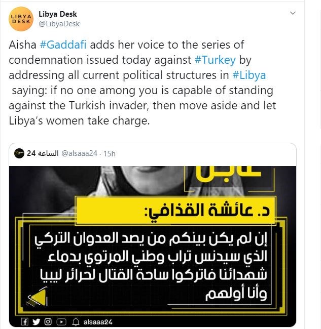 Θέση κατά της Τουρκίας παίρνει η κόρη του πρώην ισχυρού άνδρα της Λιβύης, Συνταγματάρχη Μουαμάρ Καντάφι.
