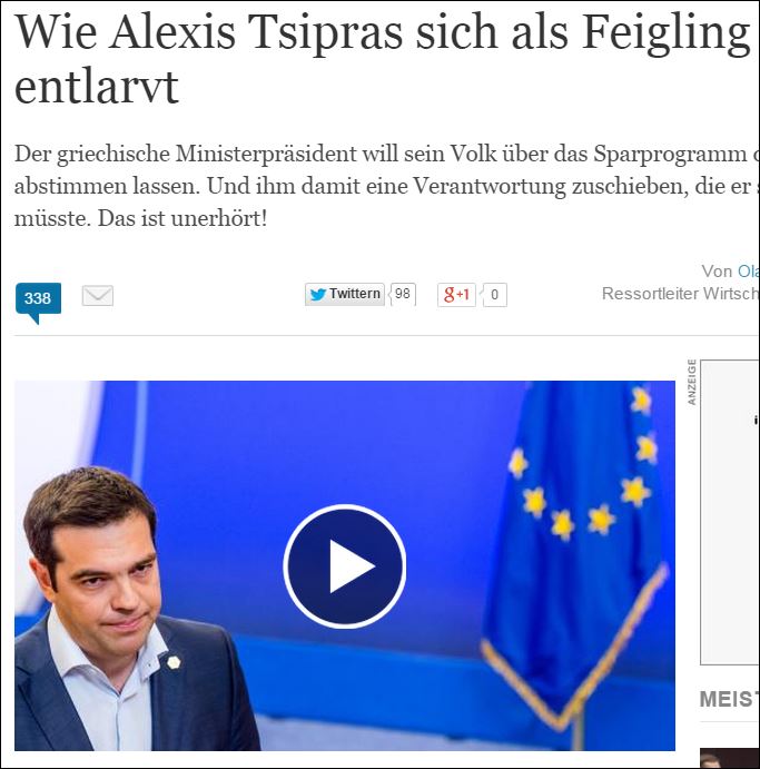 «Δημοψήφισμα για τις προτάσεις των δανειστών ανακοινώνει ο Α. Τσίπρας» (Süddeutsche Zeitung), «Ο Α. Τσίπρας μεταθέτει την ευθύνη στο λαό» (Handelsblatt) «Πως ο Α. Τσίπρας αποκαλύπτεται ως δειλός» (Die Welt), είναι μερικοί ενδεικτικοί τίτλοι γερμανικών εφημερίδων μετά την ανακοίνωση για διεξαγωγή δημοψηφίσματος στην Ελλάδα στις 5 Ιουλίου με αντικείμενο της προτάσεις των δανειστών.