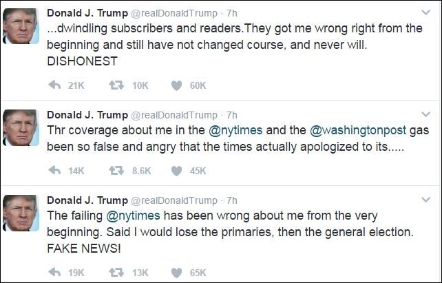 Ο πρόεδρος των ΗΠΑ έγραψε μία σειρά από tweets με τα οποία χαρακτηρίζει «ανέντιμες» τις δύο εφημερίδες, τις οποίες κατηγόρησε ότι έκαναν από την αρχή λάθος προβλέψεις για τον ίδιο (για το χρίσμα, για την εκλογή του), ότι δεν έχουν αλλάξει έκτοτε κατεύθυνση «και δεν θα το κάνουν ποτέ».