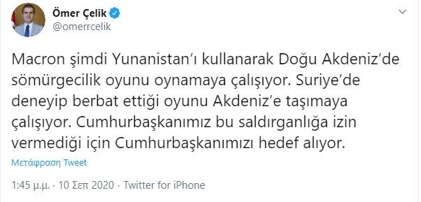 Σε άλλη ανάρτησή του ο Τσελίκ αναφέρει “ο Μακρόν προσπαθεί τώρα να παίξει αποικιοκρατικό παιχνίδι στην Ανατολική Μεσόγειο χρησιμοποιώντας την Ελλάδα. Προσπαθεί να μεταφέρει το παιχνίδι που έχει δοκιμάσει στη Συρία στη Μεσόγειο. Ο Γάλλος Πρόεδρος στοχεύει τον Πρόεδρό μας επειδή δεν επιτρέπει αυτή την επίθεση”.