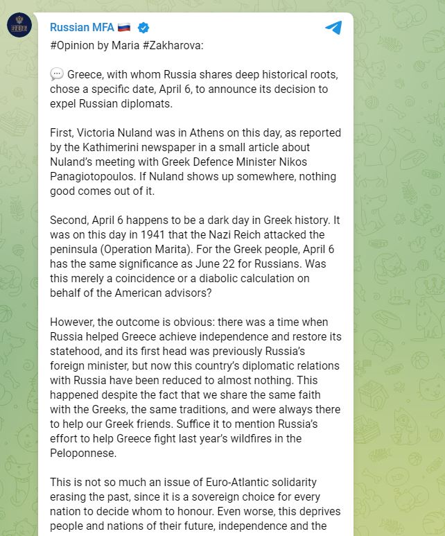 Όπως σημειώνει η εκπρόσωπος του ρωσικού υπουργείου Εξωτερικών, σε ανάρτησή της στο κανάλι της στο Telegram, “η Ελλάδα, με την οποία η Ρωσία μοιράζεται βαθιές ιστορικές ρίζες, επέλεξε μια συγκεκριμένη ημερομηνία, την 6η Απριλίου, για να ανακοινώσει την απόφασή της να απελάσει Ρώσους διπλωμάτες”.