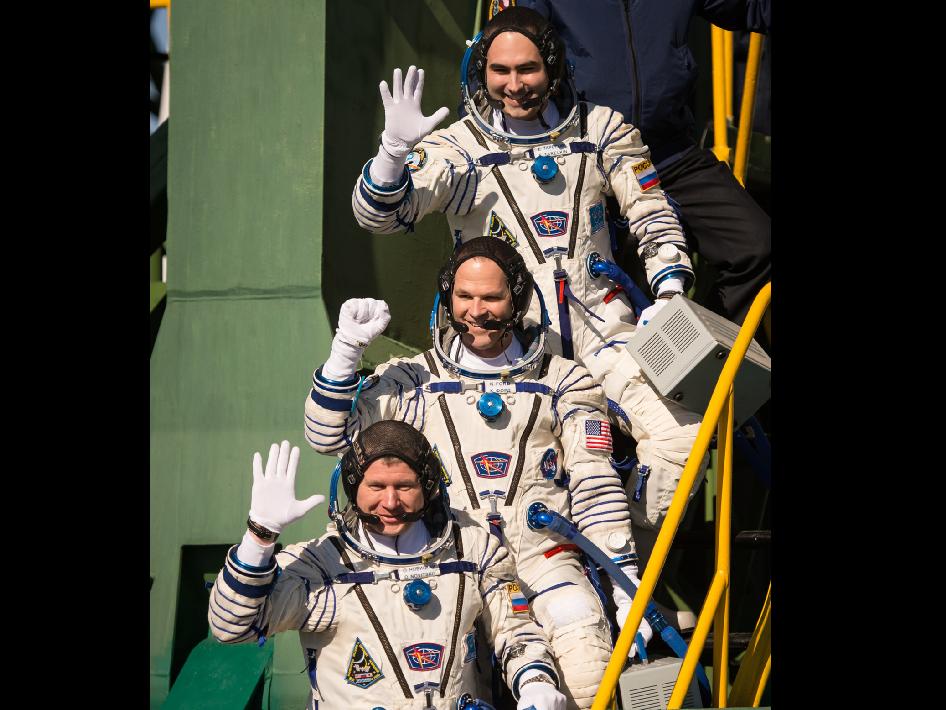 Στην φωτογραφία διακρίνονται οι τρείς κοσμοναύτες, πριν την απογείωσή τους την Τρίτη από το κοσμοδρόμιο Μπαϊκονούρ στο Καζακστάν.