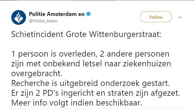 Πριν από λίγο με tweet της η αστυνομία του Άμστερμνταμ επιβεβαίωσε τον θάνατο ενός ατόμου και τη διακομιδή ακόμη δύο στα κοντινά νοσοκομεία.