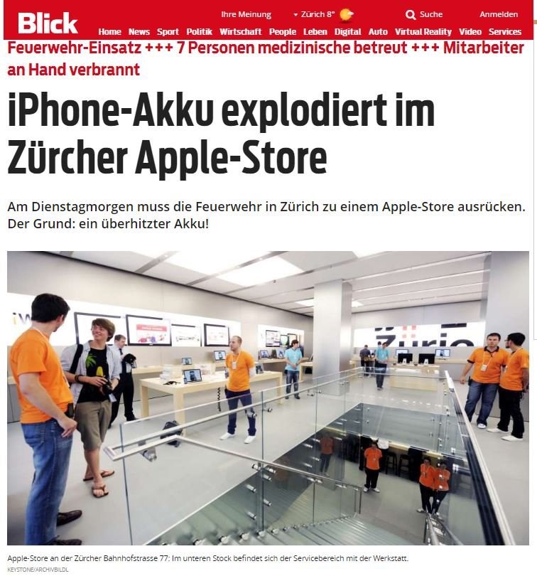 Ένα ατύχημα που είχε ως αποτέλεσμα τον τραυματισμό ενός υπαλλήλου συνέβη σε κατάστημα της Apple Store στη Ζυρίχη. Ένα iPhone εξερράγη στα χέρια τεχνικού που εργάζεται στο κατάστημα τραυματίζοντας ελαφρά τον ίδιο και άλλα έξι άτομα.Σύμφωνα με την εφημερίδα Blick, το ατύχημα σημειώθηκε όταν ένας εργαζόμενος προσπάθησε να αφαιρέσει τη μπαταρία ενός iPhone. Στη συνέχεια, σύμφωνα με τις μαρτυρίες, το κινητό τηλέφωνο υπερθερμάνθηκε και εξερράγη, με αποτέλεσμα ο υπάλληλος να υποστεί ελαφρά εγκαύματα στο χέρι.Το κατάστημα γέμισε καπνό και εκκενώθηκε για προληπτικούς λόγους. Την ώρα της έκρηξης βρίσκονταν στο κατάστημα πενήντα άτομα. Οι υπάλληλοι του καταστήματος σκέπασαν με άμμο την ελλατωματική συσκευή και ενεργοποίησαν τον εξαερισμό για να καθαρίσει η ατμόσφαιρα από τον καπνό.Σύμφωνα με την «Blick», το iPhone μεταφέρθηκε στα εργαστήρια της εγκληματολογικής υπηρεσίας της αστυνομίας της Ζυρίχης προκειμένου να διερευνηθούν τα αίτια του ατυχήματος.