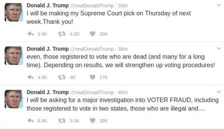 “Θα ζητήσω να γίνει μια μεγάλη έρευνα για ΕΚΛΟΓΙΚΗ ΝΟΘΕΙΑ, περιλαμβανομένων των εγγεγραμμένων ψηφοφόρων σε δύο πολιτείες, όσων είναι παράνομοι και … ακόμα, όσων είναι εγγεγραμμένοι στους εκλογικούς καταλόγους αλλά είναι νεκροί (και πολλοί εδώ και καιρό). Ανάλογα με τα αποτελέσματα θα ενισχύσουμε τις διαδικασίες ψηφοφορίας!” ανέφερε ο Τραμπ σε ανάρτησή του στο Twitter.