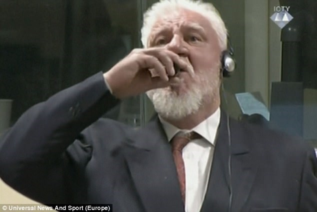 Το δραματικό συμβάν σημειώθηκε κατά την εκφώνηση της ετυμηγορίας στο εφετείο του Διεθνούς Ποινικού Δικαστηρίου για την πρώην Γιουγκοσλαβία σε βάρος έξι πρώην υψηλόβαθμων πολιτικών και στρατιωτικών αξιωματούχων των Κροατών της Βοσνίας που κατηγορούνται για εγκλήματα πολέμου και εγκλήματα κατά της ανθρωπότητας που διαπράχθηκαν στη διάρκεια της κροατομουσουλμανικής σύγκρουσης (1993-1994) στο πλαίσιο του πολέμου στη Βοσνία-Ερζεγοβίνη (1992-1995).