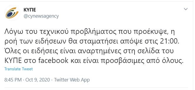 «Το Κυπριακό Πρακτορείο Ειδήσεων ανακοινώνει ότι τα ηλεκτρονικά του συστήματα έχουν δεχθεί κυβερνοεπιθέσεις, με αποτέλεσμα να διακοπεί η κανονική ροή ειδήσεων. Καταβάλλονται προσπάθειες για επαναφορά του συστήματος. Μέχρι την αποκατάσταση, το ΚΥΠΕ μεταδίδει ειδήσεις μέσω των σελίδων του στο facebook, www.facebook.com/cyprusnewsagency και www.facebook.com/cnainenglish . Η διεύθυνση του ΚΥΠΕ έχει καταγγείλει την υπόθεση στις αρμόδιες υπηρεσίες του κράτους».