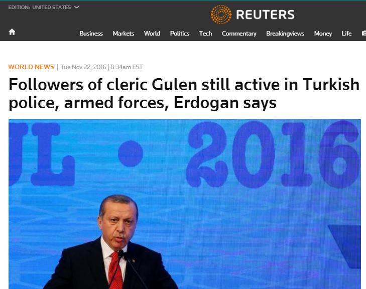 Οι υποστηρικτές του πρώην ιεροκήρυκα Φετουλάχ Γκιουλέν, τον οποίο κατηγορεί η Άγκυρα ότι ενορχήστρωσε την απόπειρα πραξικοπήματος, παραμένουν εν ενεργεία στις τάξεις των Ενόπλων Δυνάμεων, της Δικαιοσύνης και της αστυνομίας, δήλωσε ο Πρόεδρος της Τουρκίας Ρετζέπ Ταγίπ Ερντογάν, ο οποίος υποσχέθηκε να συνεχίσει τις διώξεις σε βάρος τους.