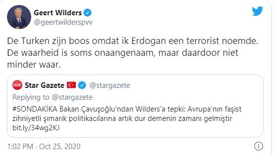 Ο Βίλντερς επέμεινε στον χαρακτηρισμό του λέγοντας πως “οι Τούρκοι θύμωσαν επειδή αποκάλεσα τον Ερντογάν τρομοκράτη. Η αλήθεια μερικές φορές είναι δυσάρεστη αλλά παραμένει αλήθεια”.