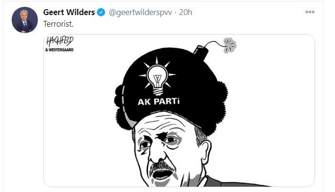 Σε νέα κόντρα εμπλέκεται ο Τούρκος πρόεδρος Ταγίπ Ερντογάν καθώς αφού εξαπέλυσε τα “πυρά” του κατά του Εμανουέλ Μακρόν, έβαλε στο στόχαστρο τον Ολλανδό βουλευτή και αρχηγό του αντι-ισλαμικού, ακροδεξιού Κόμματος για την Ελευθερία (PVV-Partij voor de Vrijheid) Γκέερτ Βίλντερς. Όλα ξεκίνησαν όταν ο Βίλντερς ανέβασε ένα σκίτσο του Ερντογάν στον προσωπικό του λογαριασμό στο twitter όπου ο Τούρκος πρόεδρος χαρακτηρίζεται τρομοκράτης ενώ απεικονίζεται να φορά ως “σουλτάνος” στο κεφάλι μία βόμβα έτοιμη να εκραγεί.