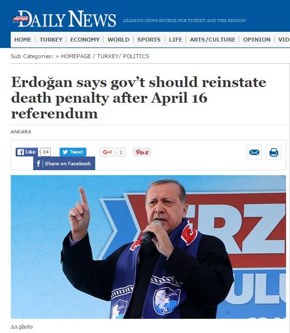 Ο Πρόεδρος της Τουρκίας Ρετζέπ Ταγίπ Ερντογάν δήλωσε ότι μετά τη διεξαγωγή του δημοψηφίσματος στις 16 Απριλίου θα φέρει νομοσχέδιο το οποίο θα επαναφέρει τη θανατική ποινή.«Μετά τις 16 Απριλίου, θα έρθει το νομοσχέδιο στο κοινοβούλιο. Εάν το κοινοβούλιο το εγκρίνει, θα το επικυρώσω» είπε ο Πρόεδρος της Τουρκίας. μιλώντας σε συγκέντρωση στην επαρχία Ερζερούμ.Σε περίπτωση που δεν υπάρξει συναίνεση στο τουρκικό κοινοβούλιο, ο Ερντογάν τόνισε ότι θα μπορούσε να διεξαχθεί ένα νέο δημοψήφισμα, με θέμα την επιβολή της θανατικής ποινής.«Για να επαναφέρει κανείς τη θανατική ποινή, χρειάζεται συνταγματική αναθεώρηση. Σε περίπτωση όμως που το κοινοβούλιο δεν την εγκρίνει, θα απευθυνθούμε στον λαό, όπως κάνουμε και με το δημοψήφισμα στις 16 Απριλίου. Ας αποφασίσει ο λαός» σημείωσε.