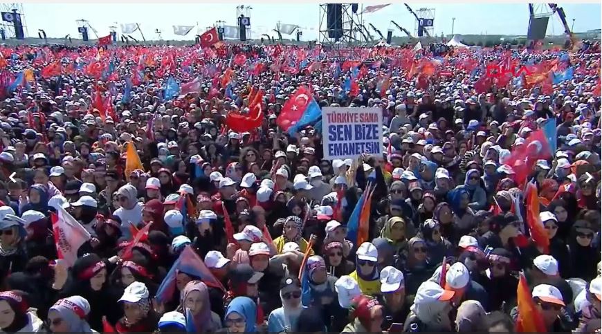 Ο Ερντογάν μίλησε σε ένα τεράστιο πλήθος, και ισχυρίστηκε ότι οι συγκεντρωμένοι στην ομιλία του έφτασαν το 1,7 εκατομμύριο, ξεπερνώντας την αντίστοιχη συγκέντρωση του Κεμάλ Κιλιτσντάρογλου ένα 24ωρο πριν. Δεν έμεινε όμως μόνο σε αυτό. Επιτέθηκε στον αντίπαλό του λέγοντας ότι «τον στηρίζουν οι μεθύστακες που έπιναν μπύρες μέσα σε τζαμιά κατά τις διαδηλώσεις για το πάρκο Γκεζί το 2013».