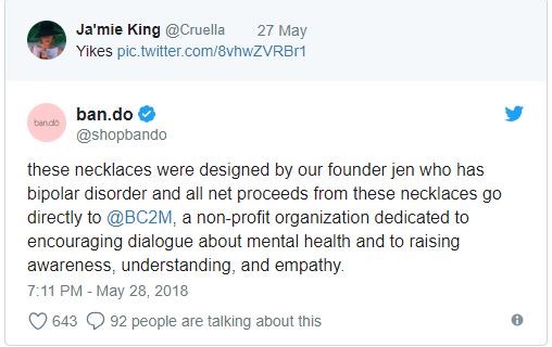Τα περιδέραια ban.do σχεδιάστηκαν από τον ιδρυτή της μάρκας και επικεφαλής δημιουργικού, Τζεν Γκοτς, ο οποίος έχει δώσει μάχη με τη διπολική διαταραχή και ελπίζει ότι τα κοσμήματά του θα προκαλέσουν την έναρξη συζήτησης για όσους μπορεί να αγωνίζονται με παρόμοιες καταστάσεις.