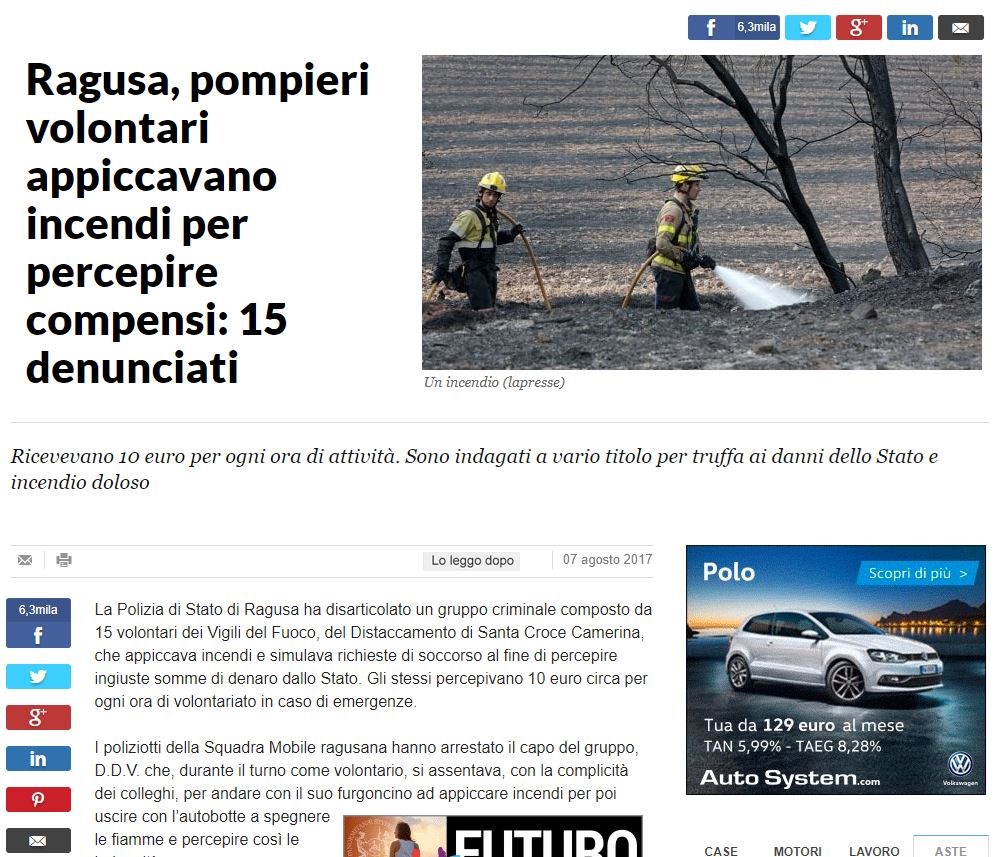 Αυτό αποδεικνύει κι η υπόθεση που διαλεύκανε η αστυνομία της πόλης Ραγκούζα στη Σικελία, η οποία εξάρθρωσε ένα δίκτυο 15 εθελοντών πυροσβεστών, οι οποίοι έβαζαν συστηματικά φωτιές και κατόπιν τηλεφωνούσαν στην έκτακτη γραμμή για βοήθεια, προκειμένου να ενθυλακώνουν τα 10 ευρώ/ώρα που προβλέπονται για τη συμμετοχή τους στην κατάσβεση.