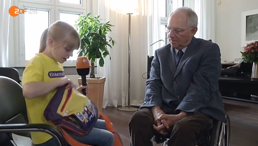 Σε μια πρωτότυπη συνέντευξη “πλυντήριο” για τον Σόιμπλε, ο υπουργός Οικονομικών της Γερμανίας, βρέθηκε στο τέλος με μία χούφτα σοκολατένια ευρώ που του πρόσφερε η πιτσιρίκα.