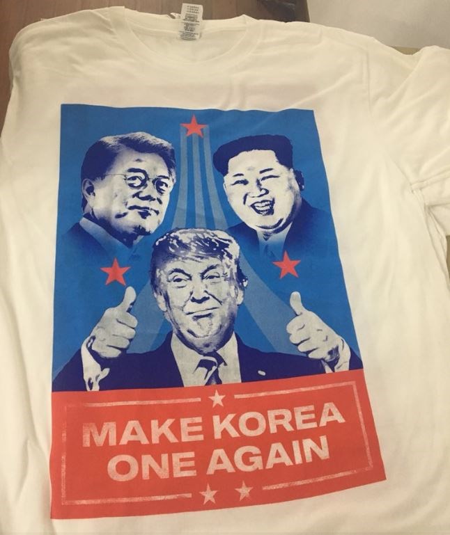 Συγκεκριμένα, στη στάμπα της μπλούζας εμφανίζονται οι δύο ηγέτες, αλλά και ο Πρωθυπουργός της Σιγκαπούρης με το λογότυπο να αναφέρει: «Κάντε ξανά την Κορέα μία».