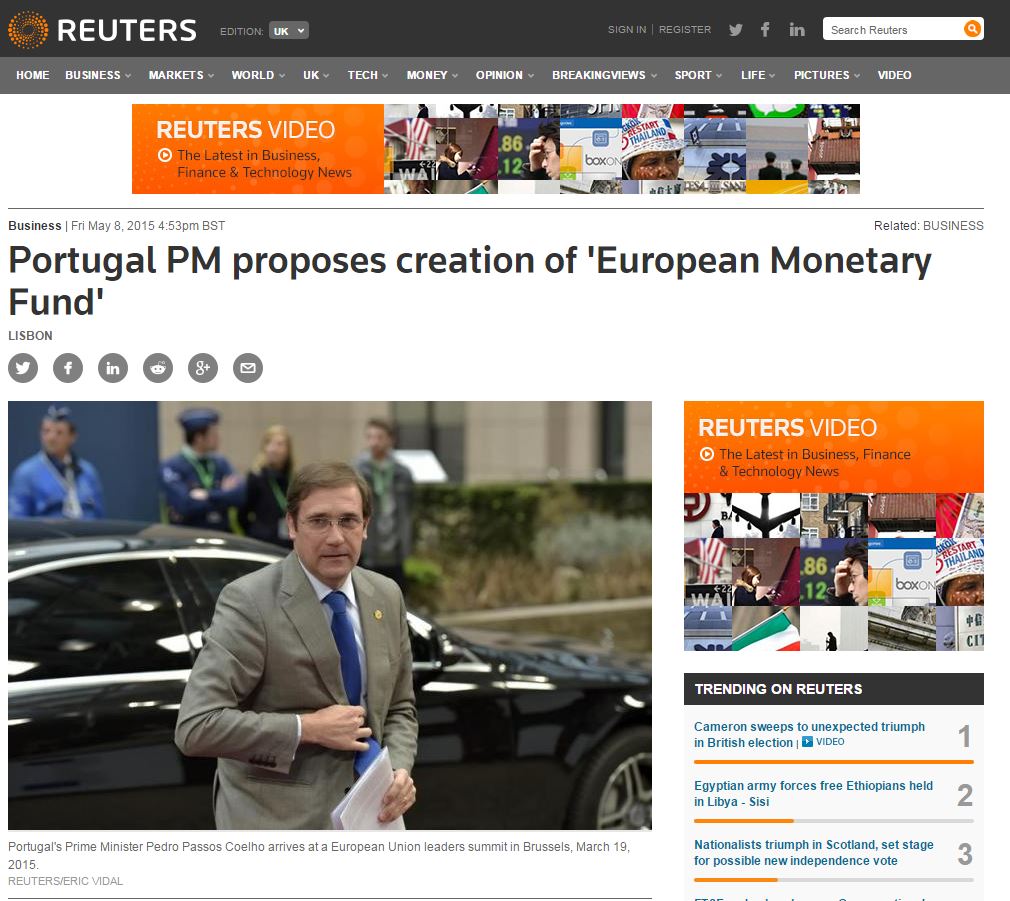 Ο Πορτογάλος Πρωθυπουργός, Πέδρο Πάσος Κοέλιο, πρότεινε σήμερα τη δημιουργία ενός «Ευρωπαϊκού Νομισματικού Ταμείου», το οποίο θα είναι ικανό να διαχειριστεί πιθανά μελλοντικά προγράμματα διάσωσης των προβληματικών κρατών – μελών της Ευρωζώνης, αντικαθιστώντας τον ρόλο του Διεθνούς Νομισματικού Ταμείου.