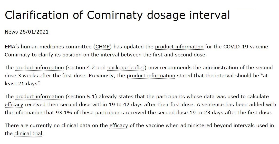 Συγκεκριμένα, ο ΕΜΑ ανακοίνωσε σήμερα, ότι συνιστά η δεύτερη δόση του εμβολίου των Pfizer/BioNtech να χορηγείται τρεις εβδομάδες μετά την πρώτη δόση, αφού παρατηρήθηκε το φαινόμενο πολλές χώρες να καθυστερούν την χορήγηση της δεύτερης δόσης για να εμβολιάσουν μεγαλύτερο αριθμό ανθρώπων.