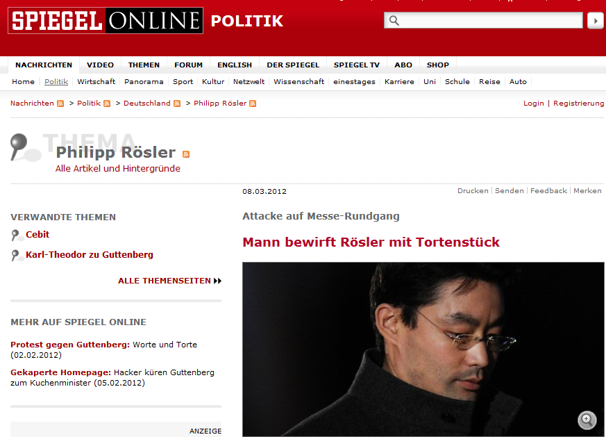 Εντύπωση προκαλεί το γεγονός ότι στα Γερμανικά Μέσα Ενημέρωσης δεν υπάρχουν εικόνες που να απεικονίζουν το νεαρό Γερμανό να πετάει στον αντικαγκελάριο της Γερμανίας Φίλιπ Ρέσλερ το γιαούρτι.Ο υπουργός Οικονομίας είχε επισκεφθεί ως επίσημος προσκεκλημένος τη -γνωστή στη Γερμανία- έκθεση ηλεκτρονικών υπολογιστών CeBIT. Και ενώ ο κ. Ρέσλερ περιφερόταν στους διαδρόμους του εκθεσιακού χώρου, ένας άγνωστος άνδρας νεαρής ηλικίας φώναξε απευθυνόμενος στον αντικαγκελάριο “Κύριε Ρέσλερ…”, τον άρπαξε από το λαιμό και στη συνέχεια του πέταξε ένα κομμάτι τούρτα.Οι άδρες της ασφάλειας του υπουργού Οικονομικών όρμηξαν στον νεαρό άντρα -που όπως απεδείχθη ήταν Βερολινέζος- τον ακινητοποίησαν και στη συνέχεια τον οδήγησαν στο αστυνομικό τμήμα Ανοβέρου.O 26χρονος άντρας προς το παρόν δεν διώκεται ποινικά ενώ οι λόγοι για τους οποίους επιτέθηκε στον Ρέσλερ δεν έχουν ακόμη διευκρινιστεί.Αυτό που προκαλεί εντύπωση ωστόσο είναι ότι εκτός από δύο φωτογραφίες δεν υπάρχει -τόσο στις γερμανικές ιστοσελίδες όσο και στα sites καναλιών της γερμανικής τηλεόρασης- υλικό από την επίθεση, ενώ “κυκλοφορούν” φήμες περί λογοκρισίας του εν λόγω υλικού.Υπενθυμίζεται ότι το υπουργείο Οικονομικών και η Γερμανική Βουλή είχε παρέμβει προκειμένου να απαγορευτούν όλες οι οι φωτογραφίες που απεικόνιζαν τον υπουργό Οικονομικών της Γερμανίας, Βόλφγκανγκ Σόιμπλε να παίζει Sudoku.