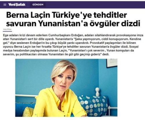 To TRHaber σχολίασε: «Η ηθοποιός Μπέρνα Λασίν, ξεχειλίζει αγάπη για την Ελλάδα, που απλώνει όπλα κατά της χώρας μας και διεκδικεί δικαιώματα στα νησιά μας».