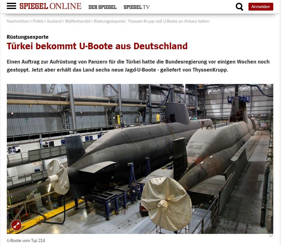 “H εταιρεία ThyssenKrupp Marine Systems (TKMS) θα παραδώσει έξι καταδιωκτικά υποβρύχια στην Άγκυρα τα οποία κατασκευάστηκαν από κοινού με μία τουρκική εταιρεία”, σύμφωνα με το ARD.