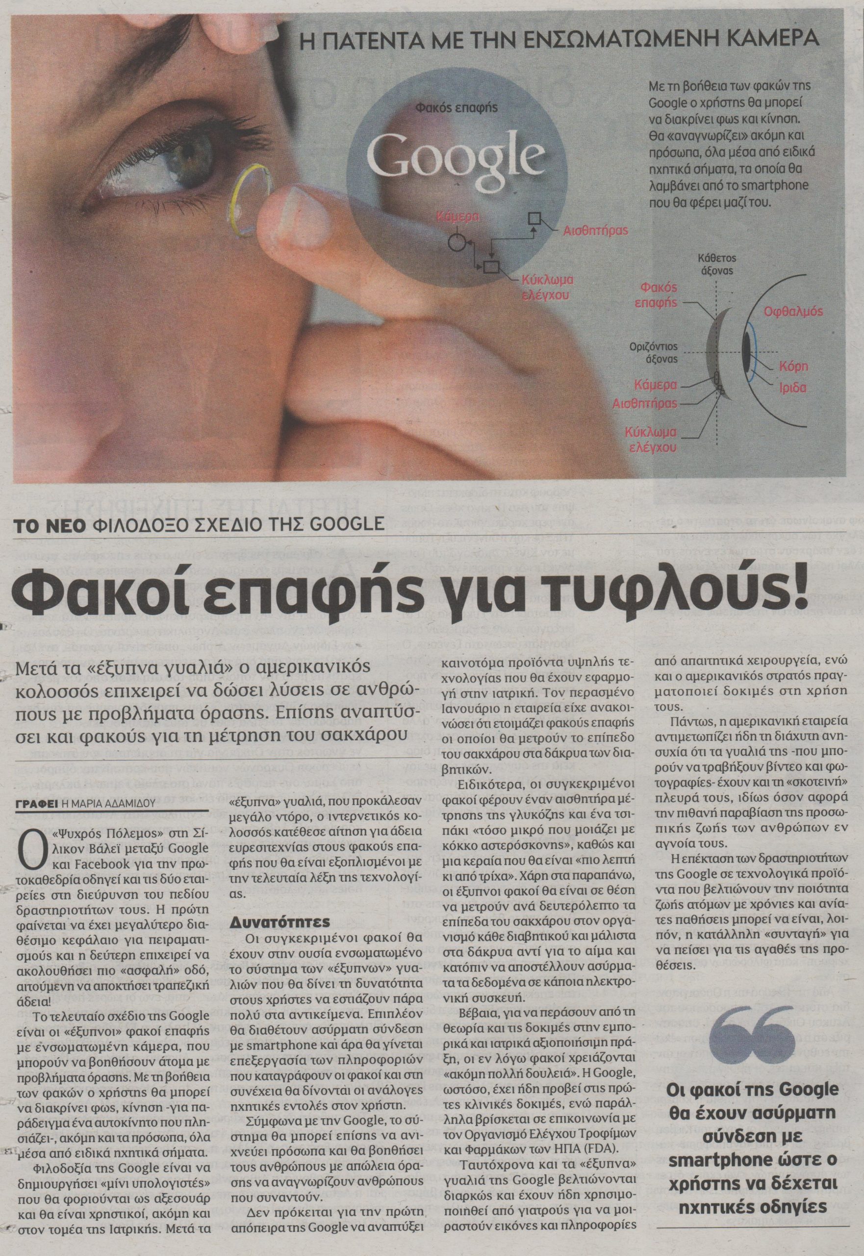 Το τελευταίο σχέδιο της Google είναι οι «έξυπνοι» φακοί επαφής με ενσωματωμένη κάμερα, που μπορούν να βοηθήσουν άτομα με προβλήματα όρασης. Με τη βοήθεια των φακών ο χρήστης θα μπορεί να διακρίνει φως, κίνηση –για παράδειγμα ένα αυτοκίνητο που πλησιάζει-, ακόμη και τα πρόσωπα, όλα μέσα από ειδικά ηχητικά σήματα.