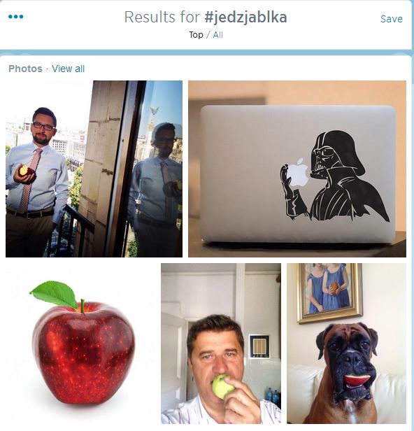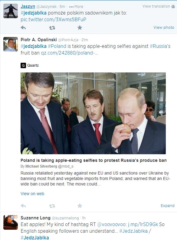 Στον λογαριασμό του Twitter #jedzjablka (φάε μήλα), δεκάδες άνθρωποι ανεβάζουν φωτογραφίες τους με ένα μήλο ή ένα μπουκάλι μηλίτη στο χέρι, προτείνουν μενού με βάση τα μήλα, άλλοι προτείνουν να σταλούν φαγωμένα μήλα στον Πούτιν…