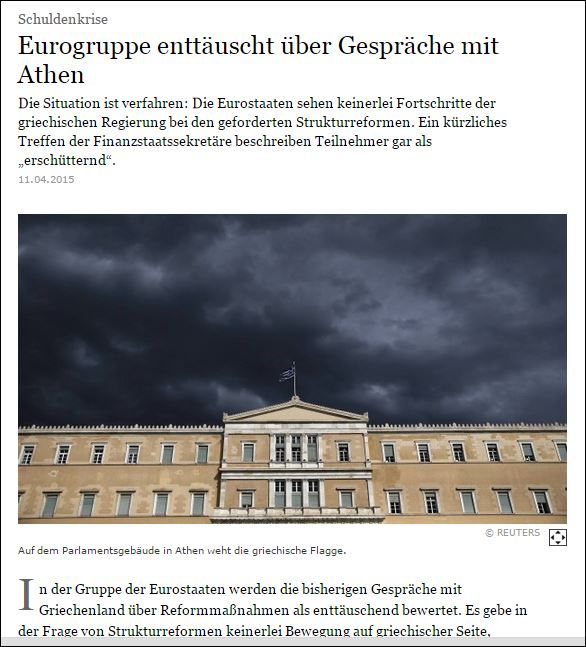 Όπως αναφέρει το Reuters, σύμφωνα με το δημοσίευμα της γερμανικής εφημερίδας, στο Euroworking Group της περασμένης εβδομάδας ο εκπρόσωπος της Ελλάδας επέμεινε ότι η χώρα θα χρεοκοπήσει σύντομα. Πηγές της Ευρωζώνης είπαν στην Frankfurter Allgemeine Sonntagszeitung ότι οι πιστωτές της Ελλάδας εάν «η Αθήνα δεν μπορέσει να πληρώσει μισθούς και συντάξεις, αυτό είναι ένα εσωτερικό πολιτικό θέμα».