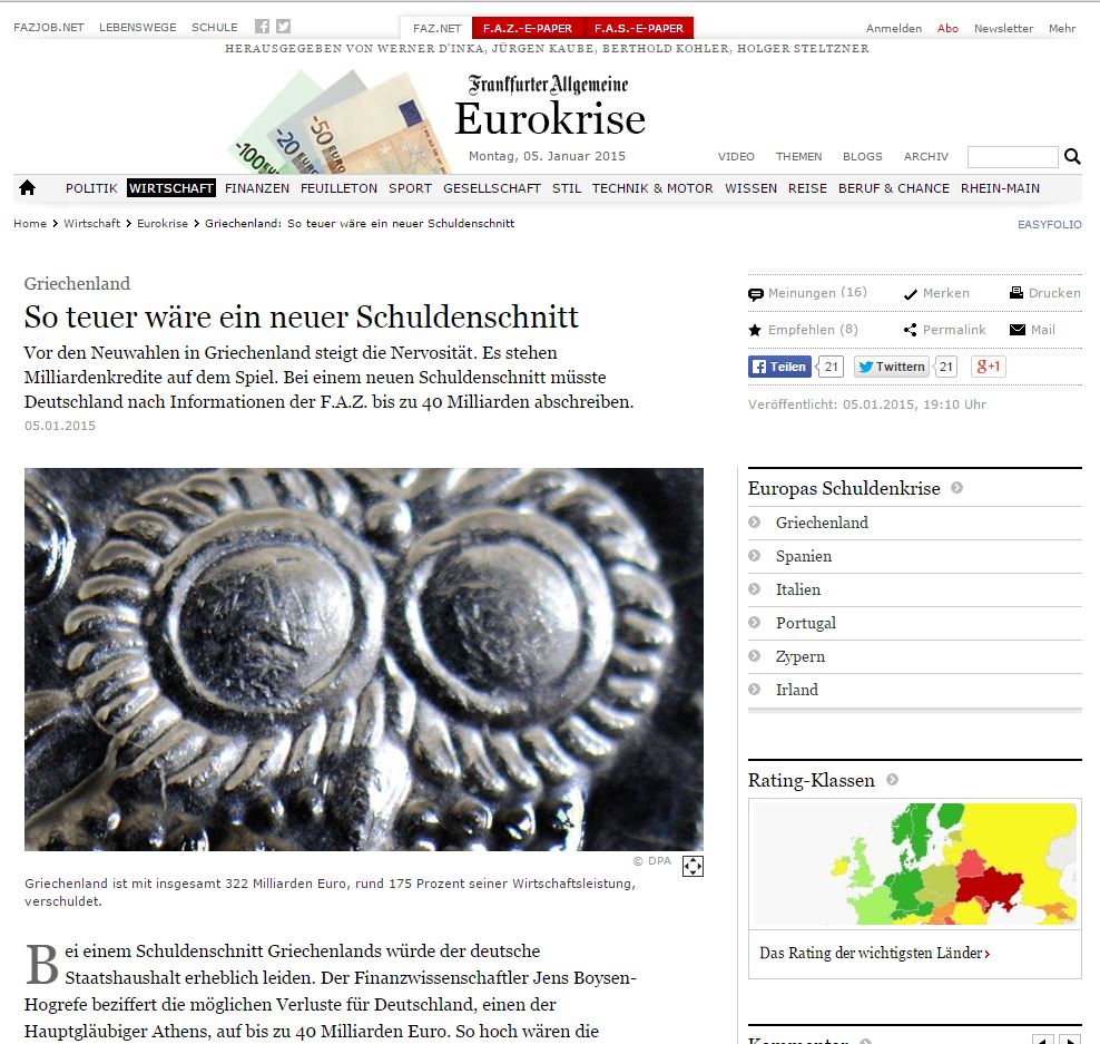 Την απάντηση σε αυτό το ερώτημα προσπάθησε να δώσει με σημερινό της δημοσίευμα η Frankfurter Allgemeine Zeitung, η οποία αναφέρει ότι ένα «κούρεμα» του ελληνικού χρέους θα κόστιζε στην Γερμανία 40 δισεκατομμύρια ευρώ, ενώ ένα «Grexit» περίπου 76 δισεκατομμύρια ευρώ.