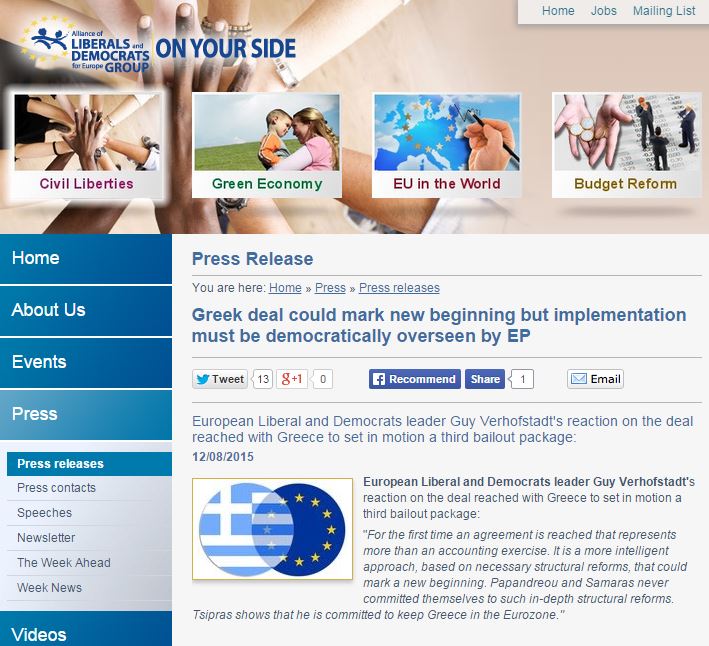 «Για πρώτη φορά επιτυγχάνεται μια συμφωνία που αντιπροσωπεύει κάτι περισσότερο από μια λογιστική άσκηση. Είναι μια πιο έξυπνη προσέγγιση, βασισμένη στις απαραίτητες διαρθρωτικές μεταρρυθμίσεις, η οποία θα μπορούσε να σηματοδοτήσει μια νέα αρχή. Ο Παπανδρέου και ο Σαμαράς ποτέ δεν δεσμεύθηκαν σε τόσο βαθιές διαρθρωτικές μεταρρυθμίσεις. Ο Τσίπρας δείχνει ότι είναι αποφασισμένος να κρατήσει την Ελλάδα στην ευρωζώνη», αναφέρει ο Φερχόφστατ στο κείμενο που αναρτήθηκε στην ιστοσελίδα της ALDE.
